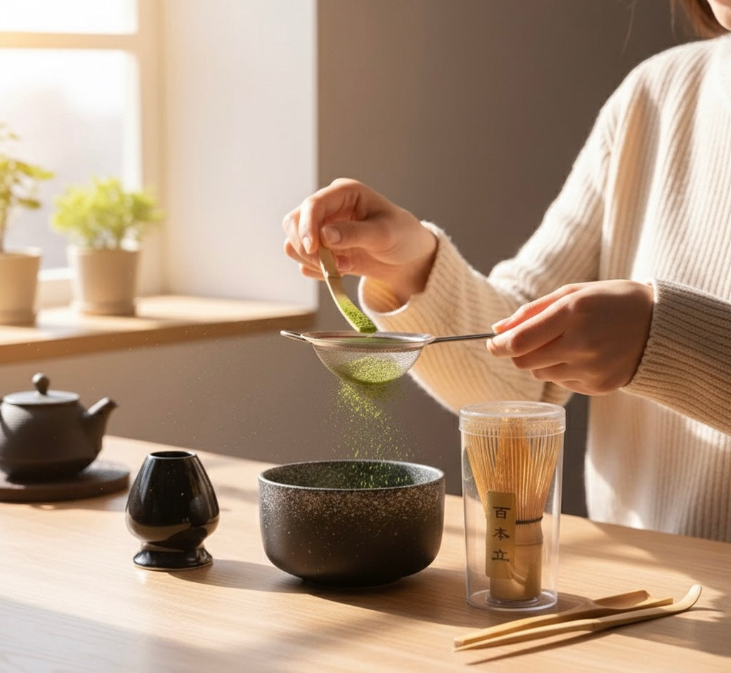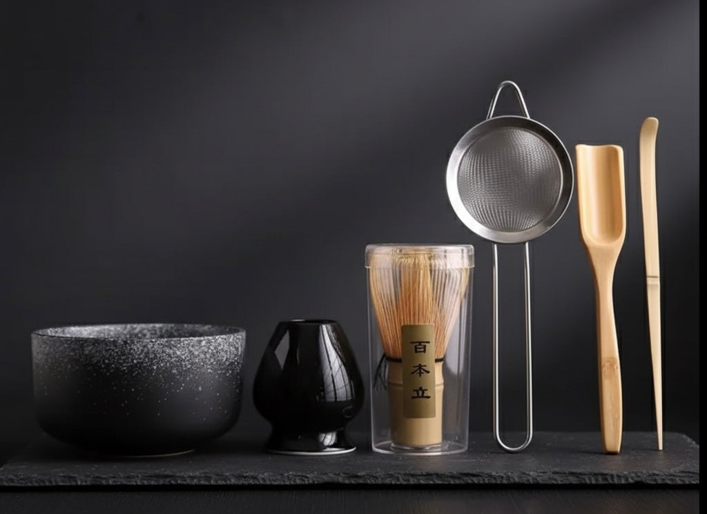 Chaque accessoire a son rôle : tamisez la poudre, ajoutez l’eau chaude (non bouillante), puis fouettez en mouvement “M” jusqu’à obtenir une mousse fine. Votre moment zen est prêt à être savouré.